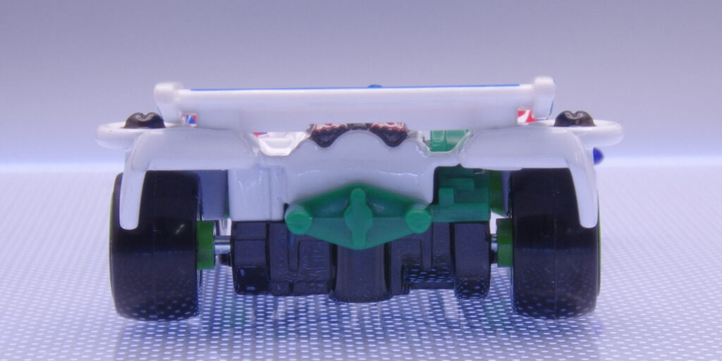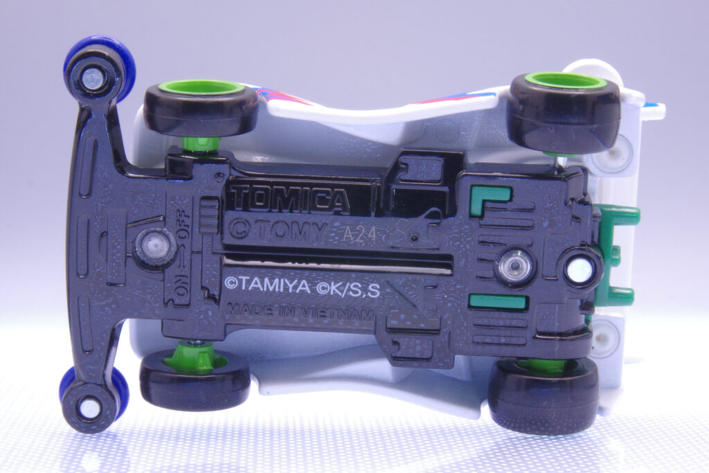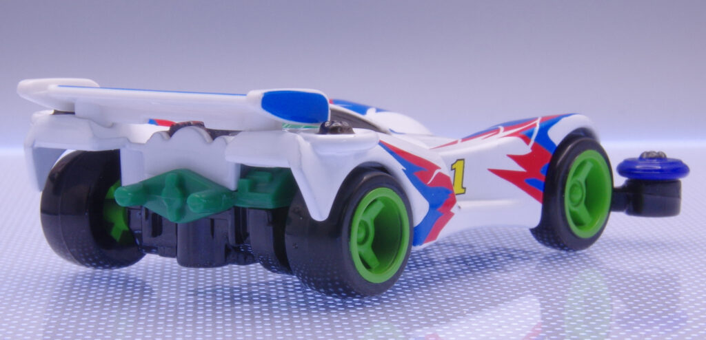 ソニックのウイングが「コーナリング用」なら、こちらは「ダウンフォース?いや、飾りだ!」と言わんばかりの、ロマンあふれるデザイン(※個人の感想です)。 翼端板の青が鮮やかです。 ソニック同様、緑色のメカニカルなパーツがシャーシ後部から覗いており、トミカとはいえ「ミニ四駆」であることを強く意識させます。