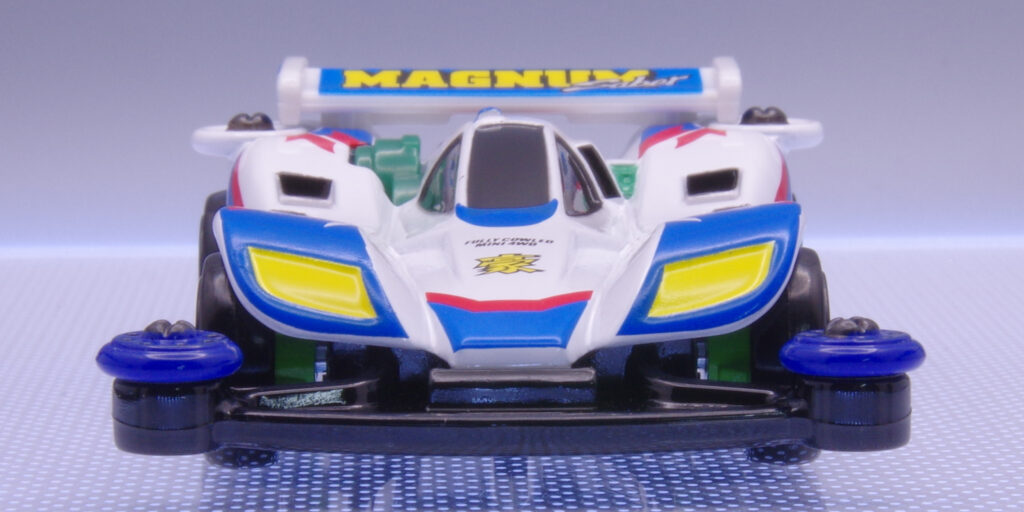 カウルに青い意匠が集中したフロントフェイス。 「俺がマグナムだ」と一目でわかるデザインです。 ボンネット中央にはもちろん「豪」の文字。その下には「FULLY COWLED MINI 4WD」の刻印。 そして、このマシンにも搭載されている青いガイドローラー! ああ、これだけで白飯三杯いけます。