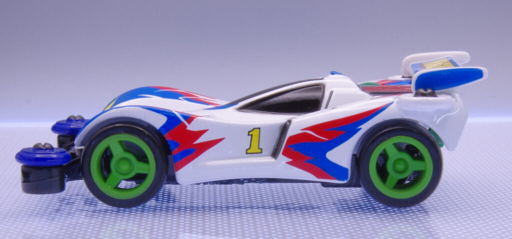 白地のボディに、青と赤の炎のようなグラフィック。 これぞ「豪」のカラーリングです。 「速さ」をこれほどシンプルに、かつカッコよく表現したデザインが他にあるでしょうか。 サイドにはゼッケン「1」。……あれ? ソニックも「1」だったような。 いいんです。彼らは二人で「ナンバーワン」なんです。 ホイールはソニックと同じく黄緑色で統一されています。