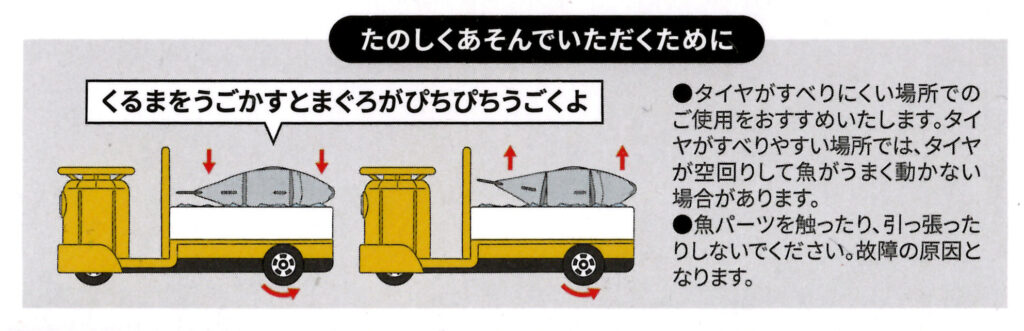 さて、最大の見どころです。 このトミカ、手転がしで走らせると……マグロの頭と尾びれが上下に動きます! 後輪の車軸とマグロの尾びれ部分が連動する機構が内蔵されており、タイヤが回ると「ぴちぴち」と振られる仕組み。走るターレーの上で、動くマグロ。 このシュールな光景は、動画で撮ってSNSに上げたくなります。