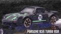 上から見ると、ルーフからハッチにかけての緩やかなラインと、対照的に角ばったフェンダーの対比がよく分かります。 ウィンドウはスモークがかかっており、パープルのインテリアが微かに覗きます。 シャーシは樹脂製で、排気系やデフ周りのモールドあり。