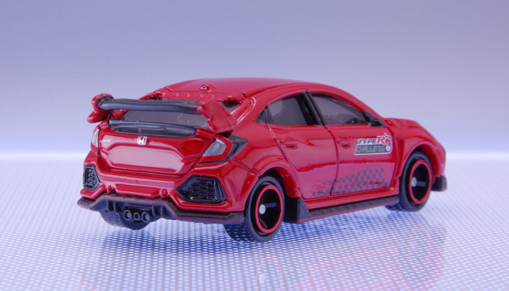 サイドには「TYPE R CHALLENGE 2018」のロゴとチェッカーフラッグ風のデカールがプリントされています。FK8型の特徴的なフェンダーデザインや、シャープなボディラインも再現されており、スポーツモデルらしい躍動感が伝わってきます。ホイールはブラックにレッドのアクセントが入ったデザインで、実車のイメージに近い仕上がりです。