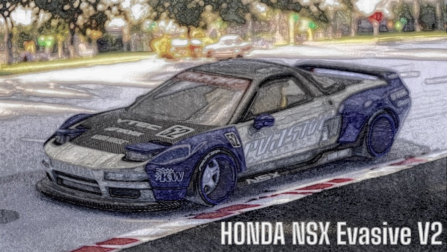 NSXならではの横長テールライトがしっかり再現されている。リアバンパー下には、Evasive Motorsportsのスポンサーロゴが施され、チューニングカーらしさを強調。ディフューザーと2本出しのマフラーも細かく造形され、走りのイメージを引き立てている。