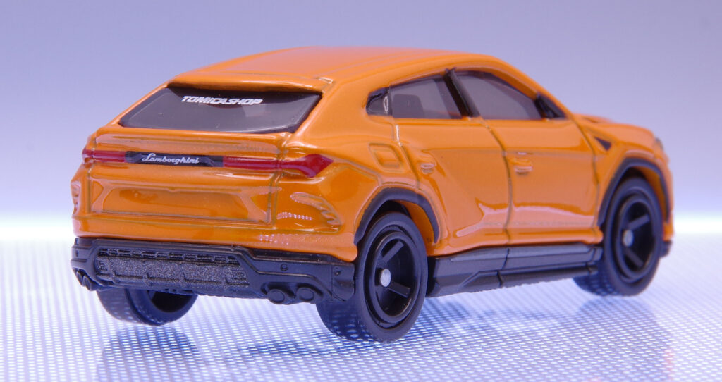 “スーパーカーの暴力的な速さを、家族で楽しむ”——その矛盾を力技でねじ伏せたのがランボルギーニのウルス。本作はトミカショップ限定カラーのオリジナル版。艶やかなオレンジにマットなブラックの下まわり、ウインドウのTOMICASHOPロゴまでビシッと決まっていて、棚に置くだけで目を引く存在感です。