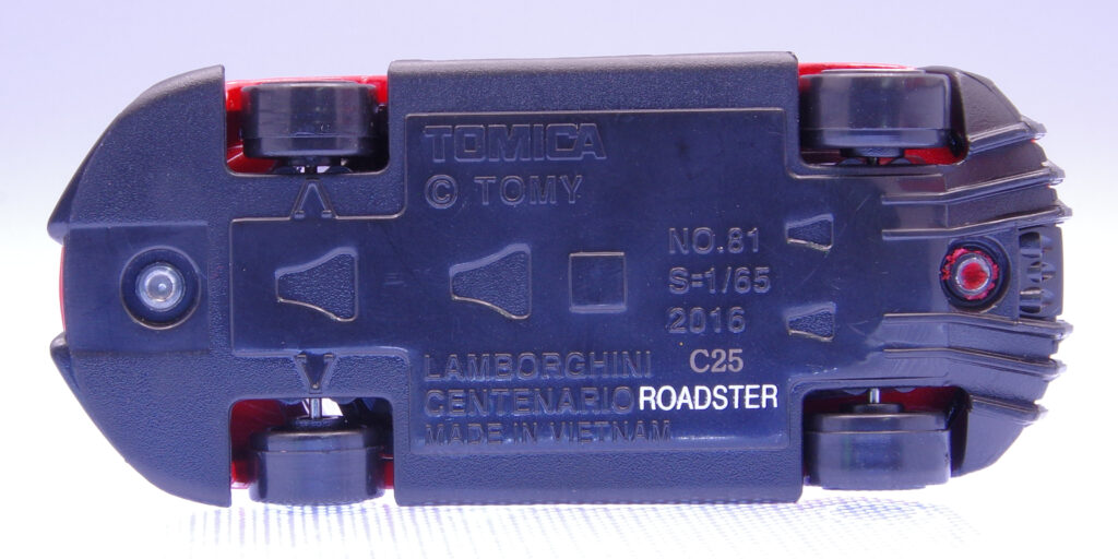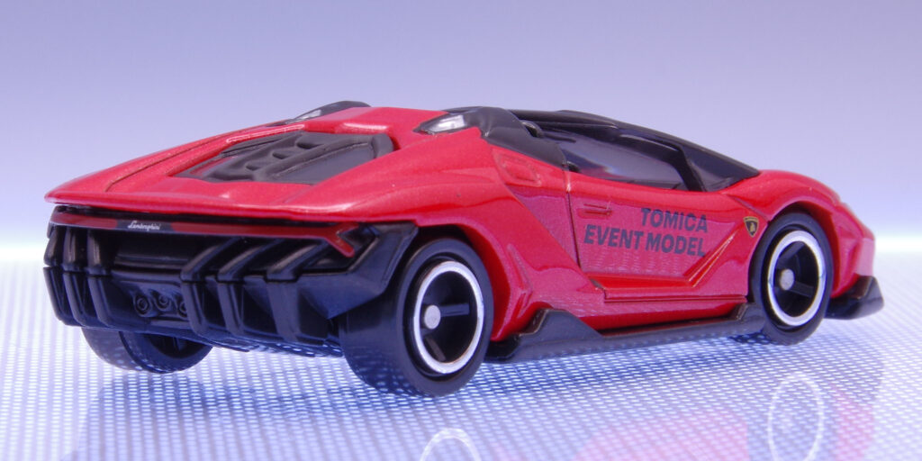 塗装のメタリックレッドも映え、通常品とはひと味違う“特別なチェンテナリオ”イベントモデルとしての主張は薄いですが、シンプル目なのが好きな方には良いと思います。通常仕様とは違うオープントップモデルとして、コレクションの一部に加えるのはありかと思います。限定品に弱い自分と同じ方にもおすすめですよ(笑)通常版のトミカ No.81 ランボルギーニ チェンテナリオ LP770-4は既に廃盤となってしまっているので、チェンテナリオが欲しかったと言う方は是非手に取って見て下さい。