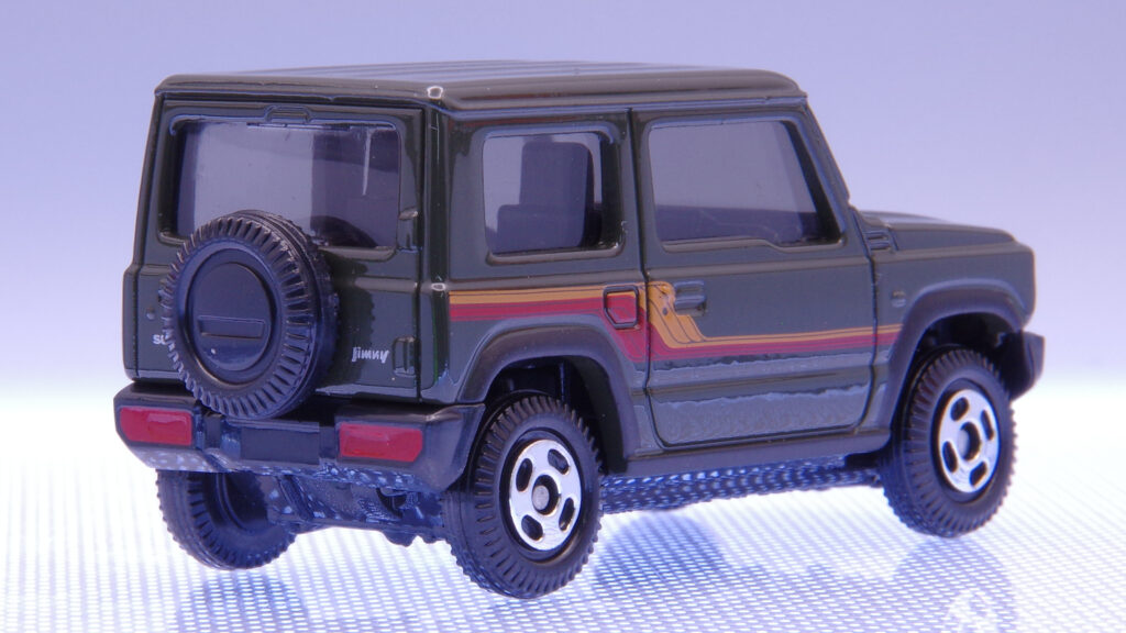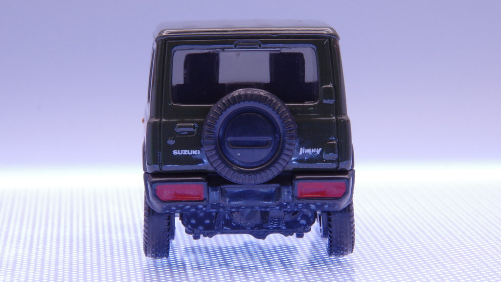 背面スペアタイヤは一体成形で厚みのある造形。テールはレッドのタンポ、右下には**“jimny”ロゴ**も入りバンパー形状や角張ったハッチまわりも見どころ多し。