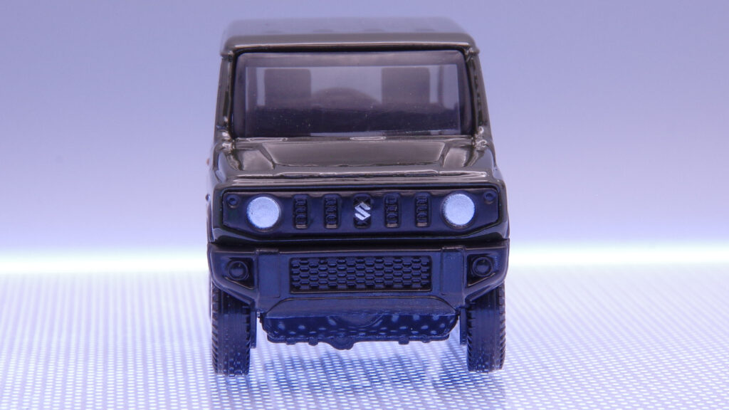 角ばったボンネットと5スロットのグリルがジムニーらしさ満点。このグリルがジムニーのアイコンですね。丸目ライトはシルバーのタンポで表現し、バンパー下のメッシュ風テクスチャもモールドでしっかり。ブラックアウトの塗り分けが効いて精悍です。