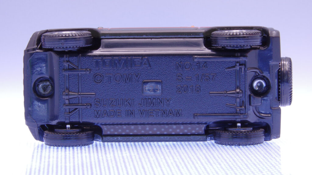 天面はプレスラインが綺麗に回り、実車の無骨さをスケールダウン。シャシー裏には「No.14 / 1/57 / 2018」の刻印。ギアや排気系の簡易モールドも楽しめます。