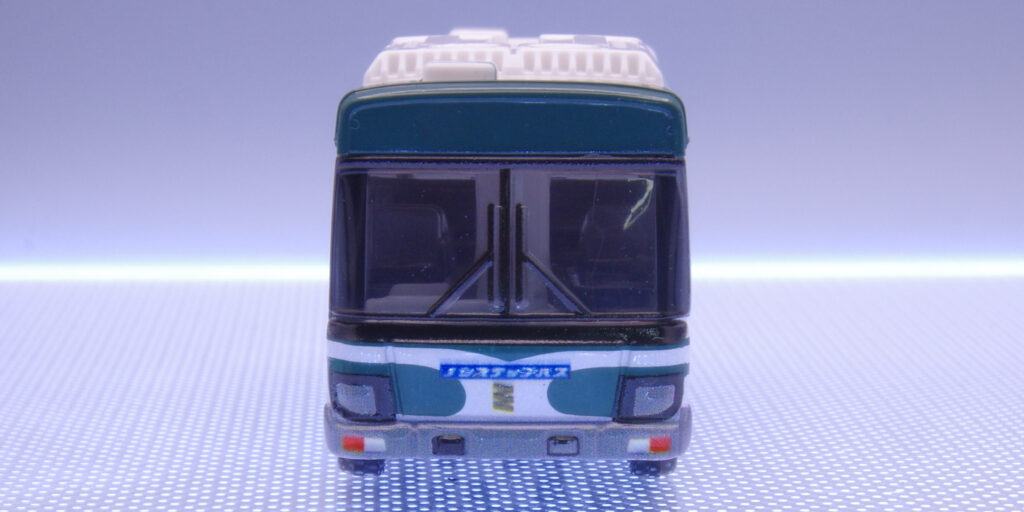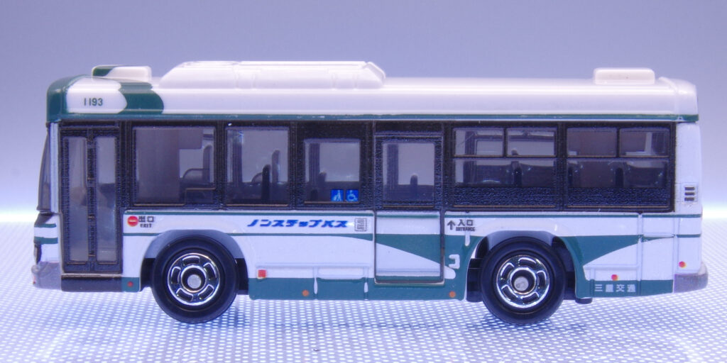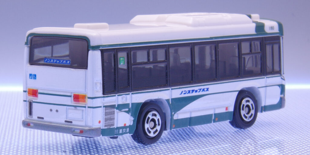 深緑の“額縁”と大きなフロントウインドウで、バスらしい安心感ある顔つき。中央の「ノンステップバス」、角の“1193”表記が効いています。バンパーの段差やライト縁の処理も素直で、正面から飾ると“いつもの停留所”がすぐ浮かびます。ヘッドライトはシルバーではなく、グレーで印刷されており余計に落ちついた雰囲気があります。