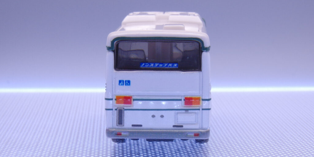 四角いランプの並び、太いバンパー、リアウインドウの「ノンステップバス」ステッカー。車椅子のマークもしっかりと印刷されており芸が細かい!