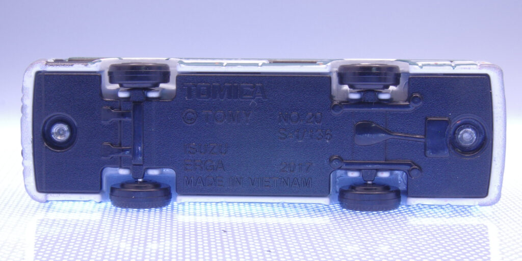 入口/出口の表記もしっかりとあります。車体全体に渡り白×緑のラインがスッと走り、どこから見ても良い作りになっています。入口側が開きそうな雰囲気ですが、残念ながら開閉ギミックはありません。