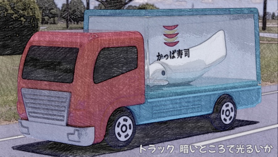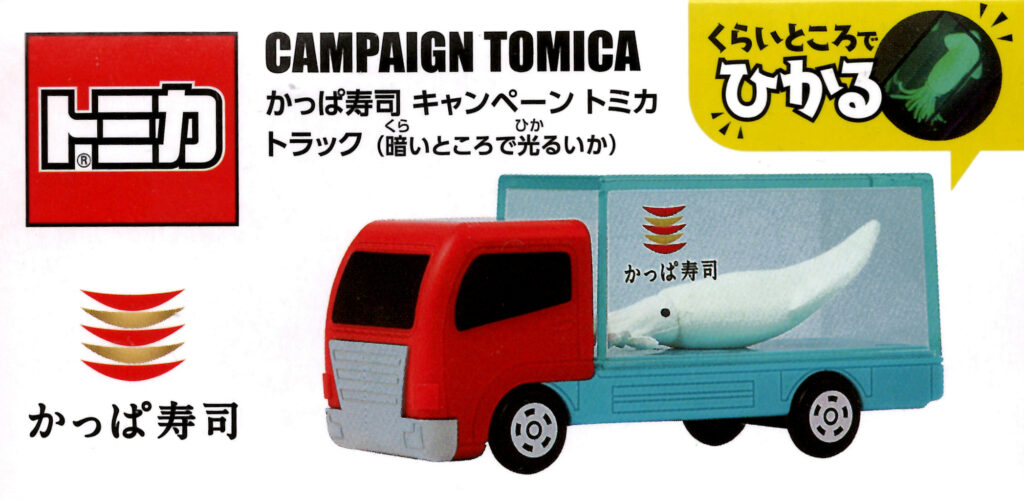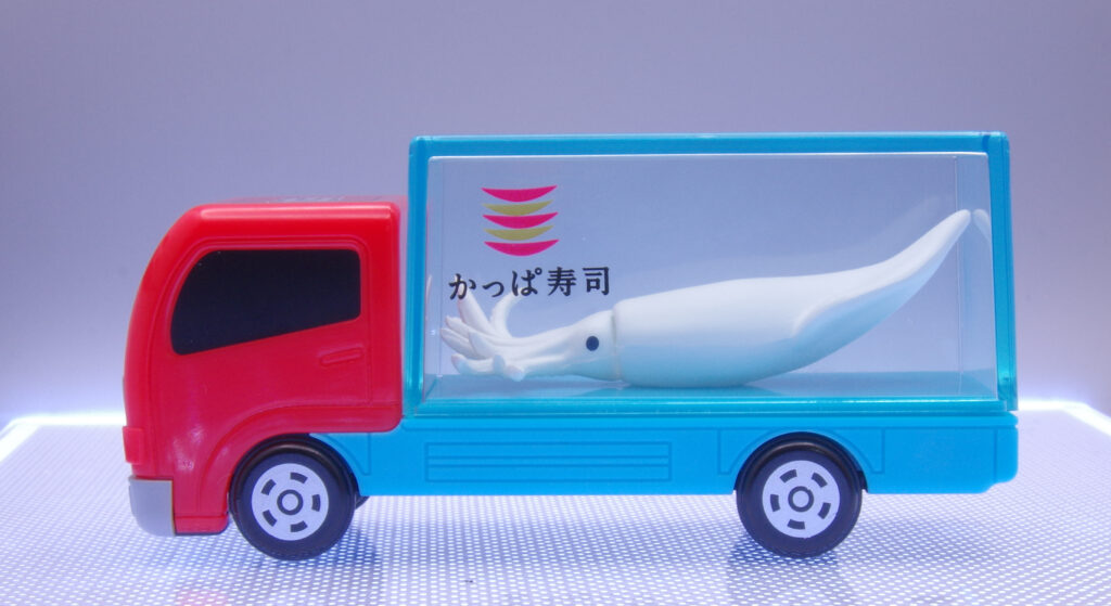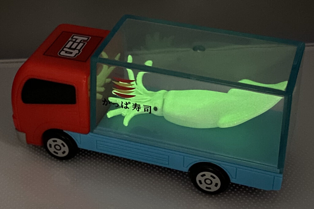 かっぱすし × トミカ トラック(暗いところで光るいか)レビュー|暗闇でピカッ。お寿司を運ぶ“ひかる”相棒