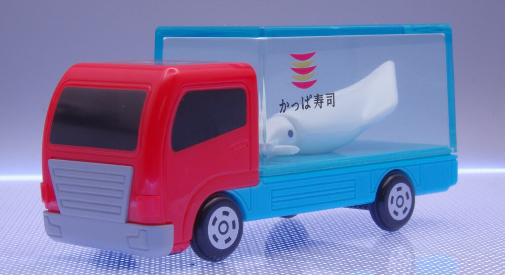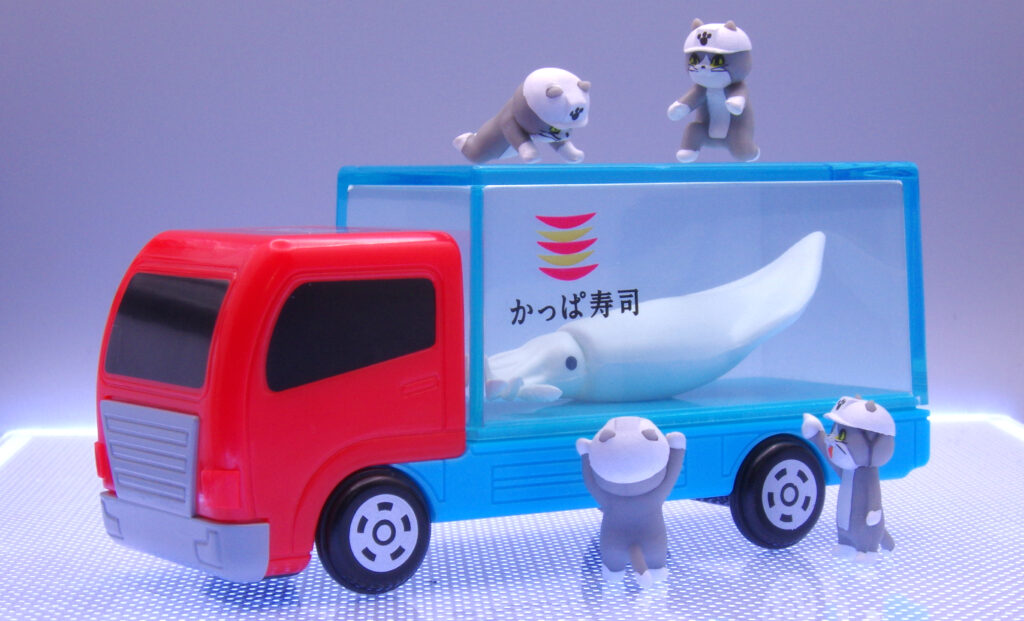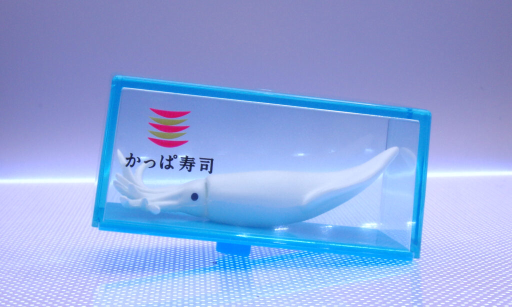 赤いボディと水槽ユニットのコントラストが強め。プロモ系らしくディテールは記号的ですが、そのぶんグラフィックが主役。かっぱ寿司のアイコンとイカが可愛らしい。