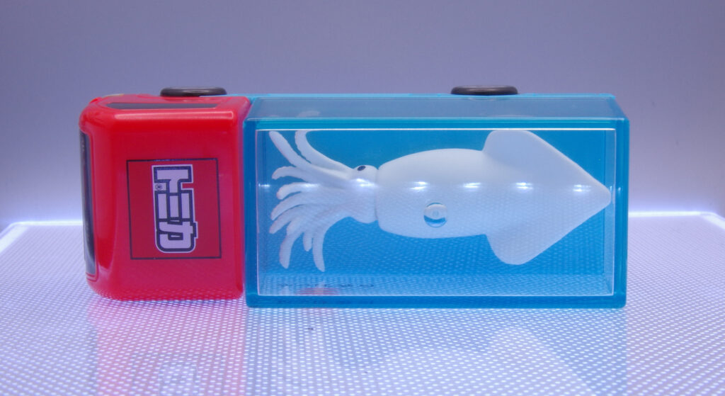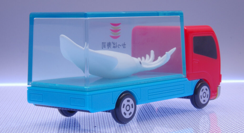 通常トミカでもマグロトラックはありますが、巨大なイカを組み合わせたのが良い所。樹脂製なのは個人的に少し残念ではありますが、他のキャンペーンでもらえるトミカも樹脂製なので、そこと並べるには同じ仕様のほうが統一感があって良き。手に入れたら部屋を暗くたり、手のひらで覆ってみたりして一回“点灯式”してみたくなるやつですね!