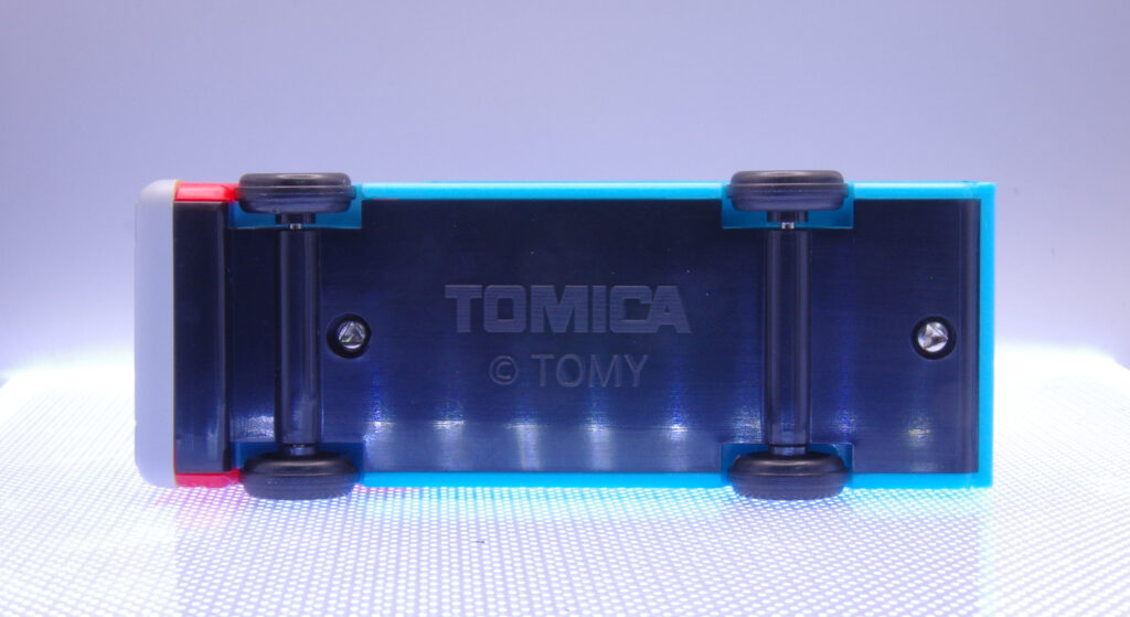 上から見ると水槽の面積が大きく、イカが主役なのが一目瞭然。底面はプロモトミカらしい一体成形でシンプル。全体が樹脂製で通常トミカより一回り大きいサイズ。