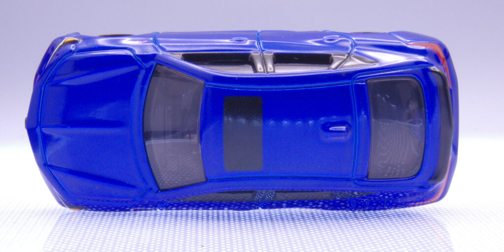 横長のテールがワイド感を演出。テールランプは初回仕様はブラックで印刷されており、ボディカラーに紛れ込まず良い感じ。ウィング部分もブラックで色分けされており、細かい所まで再現されています。リアビューの落ち着きが、このミニカーの上品さの要だと思います。